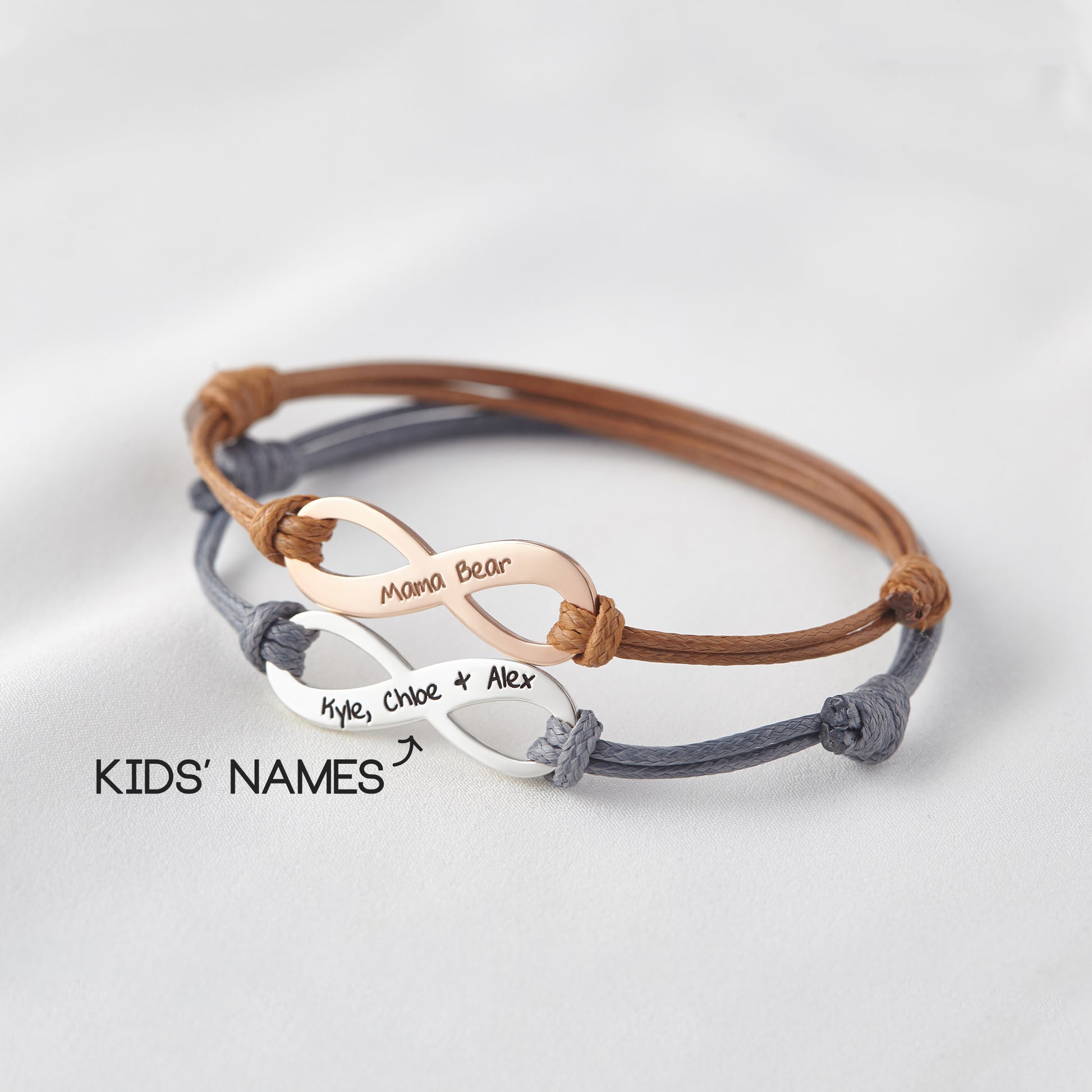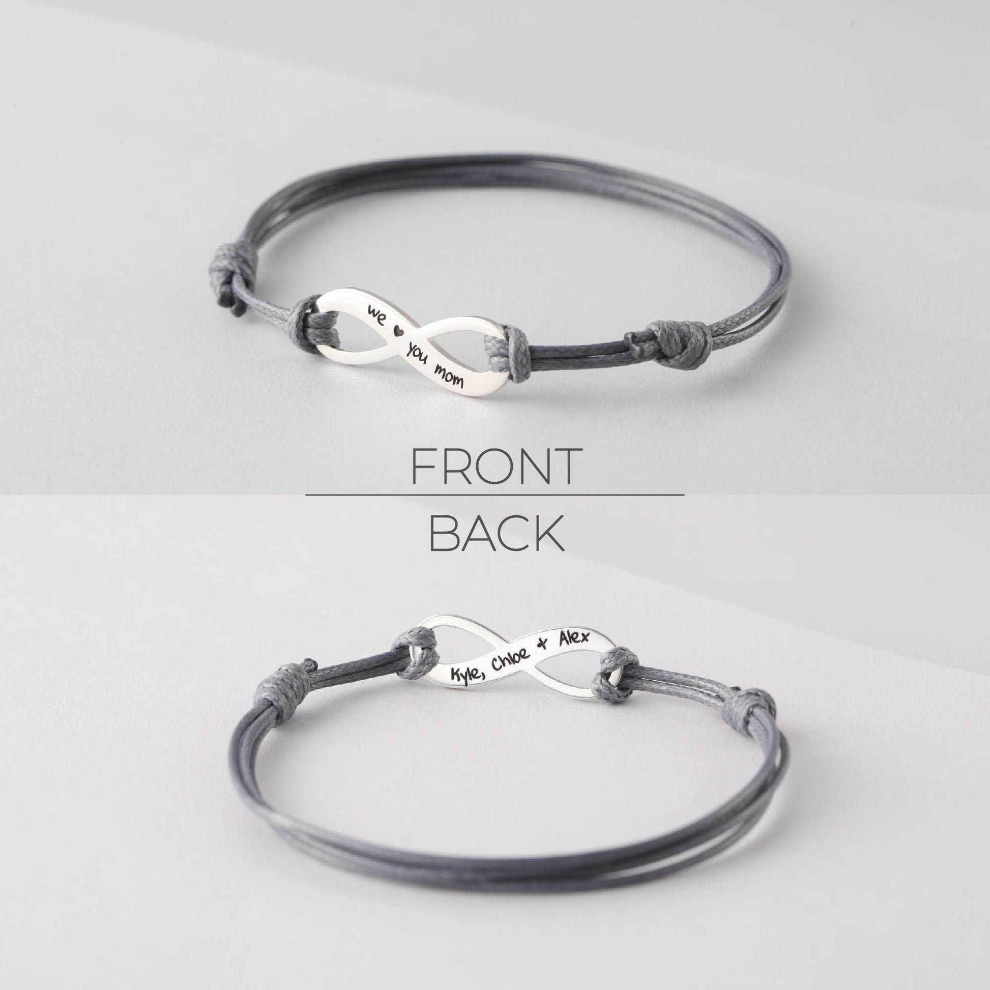 Please send us in the checkout note the following information: Enter the names, date or a short message you want here. • Word limits: 3-4 short words/side • Bracelet size is adjustible (XS to XL) ABOUT THIS ITEM This beautiful infinity leather bracelet is absolutely a perfect gift for your mom to carry kids' names along with a short message on the infinity pendant close to her heart. P R O D U C T • I N F O ✅MATERIAL: High Quality Solid 925 Sterling Silver with 18K Gold, Rose Gold-Plated with PU leather cord. Product is safe for sensitive skin, Lead-Free & Nickle-Free. ✅ DIMENSIONS: The infinity charm measures approx. 5/4" (30mm) in length and 3/8" (10.5mm) in width ✅ENGRAVING: By default, silver item comes with BLACK engraving and gold-plated item comes with CLEAR engraving. ✅PERFECT UNIQUE GIFTS & PACKAGE: It's a perfect gift for yourself and your loved ones: your mother, friend, girlfriend, grandma, sister, wife, daughter on Anniversary, Birthday, Special Occasions, Christmas' Day, Wedding and much more! All of our jewelry are handmade from scratch and packaged with care in our workshop. Come in complimentary gift box. ✅SATISFACTION GUARANTEED: Each item is carefully handcrafted & undergoes a rigorous inspection process to ensure our products meet the highest possible standards. All engraving comes with a satisfaction guarantee.